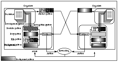 Motivated by above-mentioned consideration, we have started investigating the feasibility of the evolution of color patterns on the surface of artifact-systems using the dynamics of predator-prey interactions observed in nature. This paper describes the concept of "Evolvable Exterior", and then reports our efforts to abstract the evolutionary mechanism of color pattern generation and color pattern recognition, and to construct a model in which coevolutionary dynamics automatically generate some of the color patterns that one observed in nature one after another. In the model, the world has several species among which there are predator-prey relationships (Fig. 1). Each organism has a pattern development system and a pattern recognition system. The pattern development system, which can be considered a two-dimensional extension of the 0L-system by Lindenmayer, has five generative grammars, which are passed on to offspring by genetic operations. One of the five grammars develops the color pattern on its epidermis. The other four grammars develop color patterns for recognizing its predators, its prey, its kin and the background, respectively, which are compared with the color patterns on the epidermis of the organisms it has encountered. Various transitions of color patterns have been observed in the experiments (Fig. 2). The epidermis patterns of organisms as prey have a tendency to become misleading patterns, for example, which are similar to the patterns for predators in the recognition systems of the predators. At the same time, the epidermis patterns of the organisms as predators also have a tendency to become misleading patterns, for example, which are similar to the patterns for prey in the recognition systems of the prey. Color patterns developed by the grammars for recognition, in general, follow the transitions of color patterns of prey, predators and kin, because the more similar the patterns are, the higher the organism's score. Coevolution requires a specific evolutionary response by both species: specific new defences by the prey must be continually counteracted by specific new defence-breakers in the predators and vice versa.